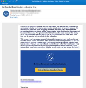 We want to make sure you are aware of a current potential threat to your IT security. There has been a large increase in spam and phishing emails related to COVID-19. Hackers are sending out numerous emails that try to trick people with fake information related to the pandemic. Most of the emails look like they are coming from official sources (such as governments, the CDC, WHO or other health-related organizations) and are very convincing. These emails often have links or attachments that when clicked will harvest personal information, or infect the users’ computers with various malicious attempts.