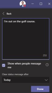Set Your Status – Tired of responding to each person who messages you telling them where you’re at? Use the status feature to set up a single message that will be shown at the top of the chat window when anyone tries to message you. On top of that you can set a date / time when the message will automatically be removed.To access this feature click on your avatar icon then choose “Set a status message” and enter the details. Now whenever anyone starts a chat with you, your status will be displayed. It’s a great way to keep up communication among your team now that almost everyone is working outside the office. You can also use the basic status messages such as busy, away, off work etc by clicking on your avatar and using the built in status options that show directly underneath your avatar.